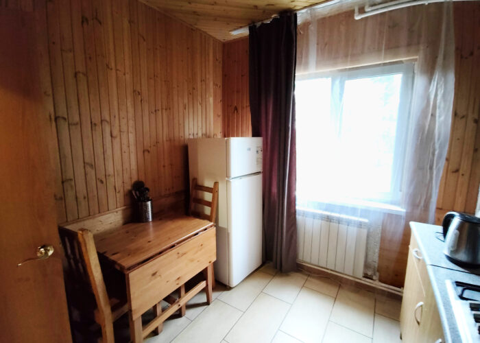 Уютная кухня, полностью оборудованная для комфортного быта наших гостей, здесь есть все необходимое: столовая мебель, холодильник, плита, посуда для каждого гостя.